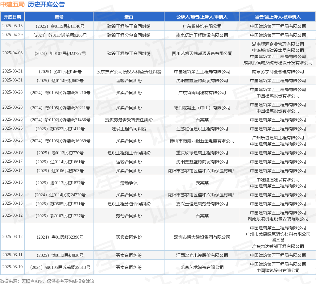 本站消息,根据天眼查APP显示,近日公布了一则中国建筑第五工程局有限公司作为被告/被上诉人的开庭公告,详细内容如下: